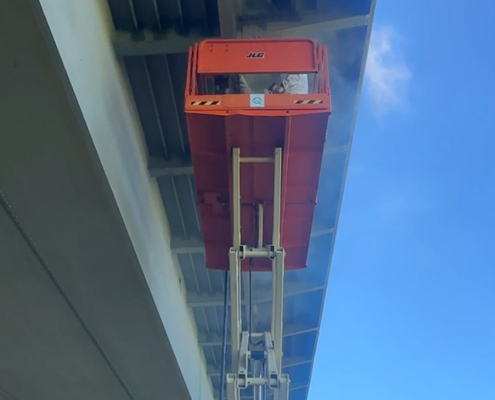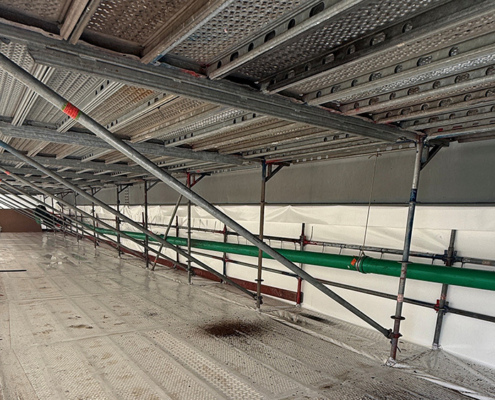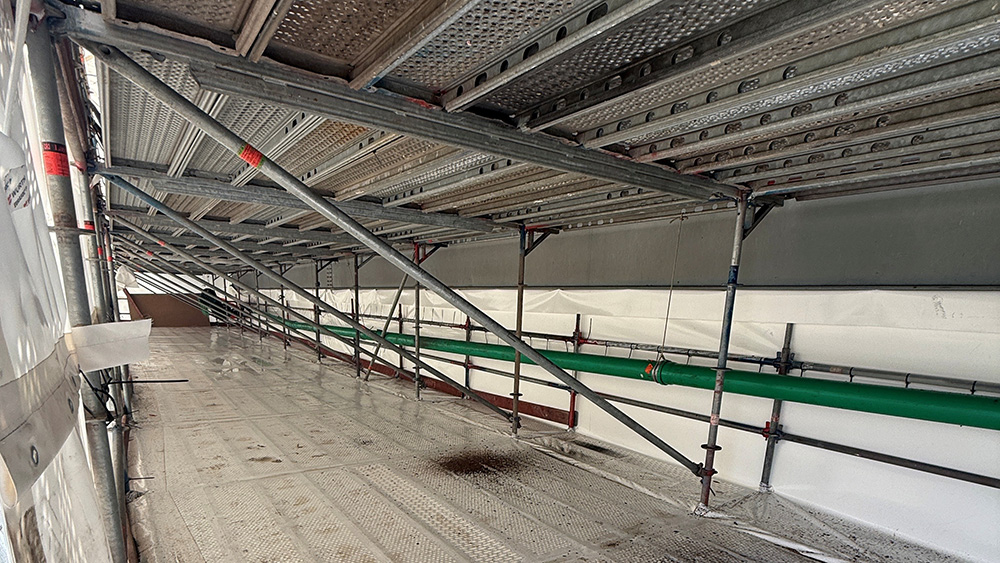 Nach dem Neueinbau der Fahrbahnplatten erfolgt die Neubeschichtung inkl. Oberflächenvorbereitung (Strahlen SA 2½) mittels einer 4 mm starken Schottertrogbeschichtung im Airlessspritzverfahren. Da kein Schotter einzubauen war, die Fläche aber in Notfällen begehbar sein müssen, wurde der Belag im Anschluss an die Grundbeschichtung 2-schichtig eingebaut, wobei die zweite Schicht abgestreut wurde. Anschließend erfolgte eine farbige Versiegelung der Flächen. Diese Arbeiten begangen im April 2024 und wurden im September 2024 abgeschlossen. In Spitzenzeiten waren ca. 25-30 Mitarbeiter von uns im Einsatz.