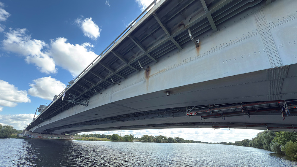 - Korrosionsschutztechnische Bearbeitung der Krafteinleitungspunkte der Hängerseile in den Brückenquerschnitt von unten (100 Stellen)